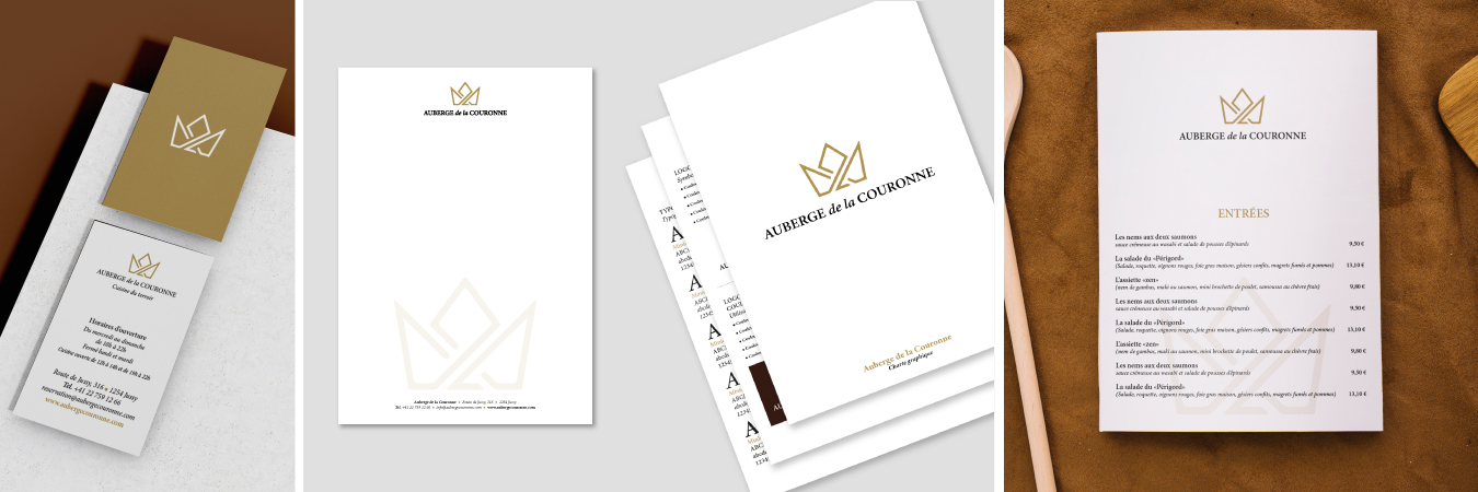 AUBERGE DE LA COURONNE – JUSSY Recherche et proposition de logos | Création de la nouvelle charte graphique | Création et suivi d’impression de la papeterie institutionnelle | Déclinaisons pour les différents supports : menus, encarts publicitaires, réseaux sociaux.