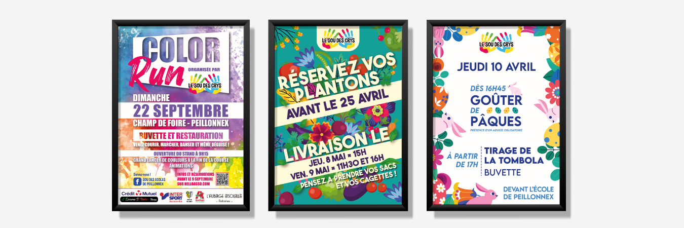 ASSOCIATION LE SOUS DES CRYS – PEILLONNEX Design graphique des affiches, flyers, petite papeterie | Mise en page des échanges avec l’équipe pédagogique et/ou les parents d’élèves.